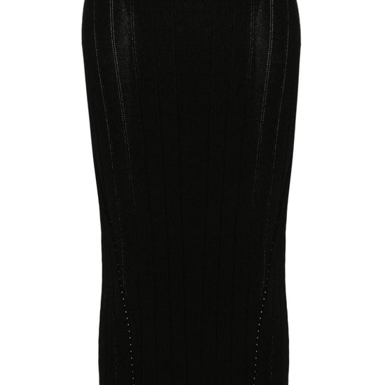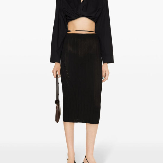 Black ribbed knit gold-tone logo lettering pencil silhouette high waist adjustable waist strap straight hem mid-calf length la jupe pralu midi skirt size and fit - this piece fits true to size. we recommend you get your regular size. model is 1,75m / 5ft 8in wearing size 36 (fr)