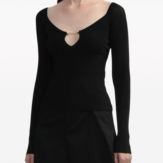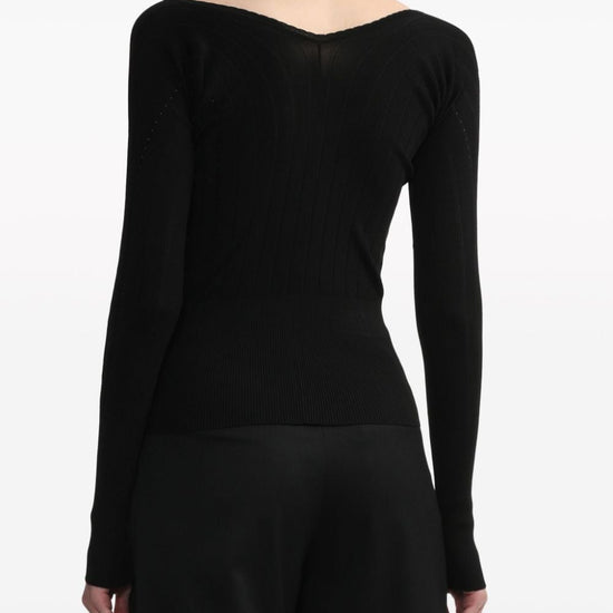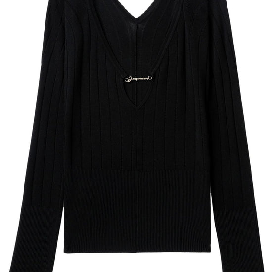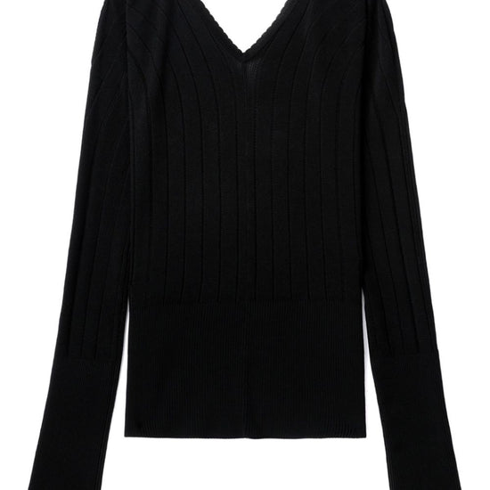 Black ribbed knit v-neck long sleeves ribbed cuffs and hem le haut pralu top size and fit - this piece fits true to size. we recommend you get your regular size. model is 1,75m / 5ft 8in wearing size 36 (fr)
