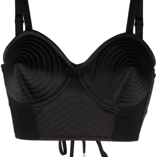 Jean-paul gaultier e lotta volkova condividono un debole per i design eccentrici, quindi è naturale che questo reggiseno trapuntato della loro collaborazione trasmetta lo stesso credo. realizzato in raso setoso e rivestito in jersey, presenta un retro con lacci e coppe a cono che richiamano i codici della lingerie vintage anni '50. nero, trapuntato, spalline sottili, forma conica, chiusura posteriore con laccio, orlo dritto. conical corset cropped top size and fit - this piece fits true to size. we recommend you get your regular size. model is 1,75m / 5ft 8in wearing size 36 (fr)
