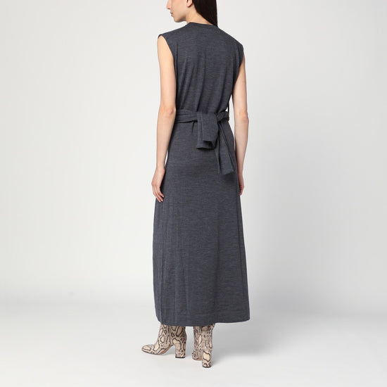 Gray wool midi crew neck dress by jil sander, featuring waist loops with a crossed detail at the front that ties at the back, sleeveless design, and ribbed edges. size and fit - model wears size 36 fr model measurements: height: 179 cm chest: 82 cm waist: 65 cm hips: 90 cm