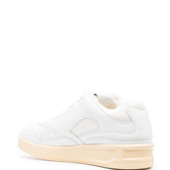 Panelled low-top leather sneakers from jil sander featuring white, calf leather, panelled design, debossed logo to the side, perforated detailing, round toe, front lace-up fastening, branded leather insole and flat rubber sole. low-top leather sneakers size and fit - heel 1,4 in / 3,5 cm; platform 1 in / 2,5 cm