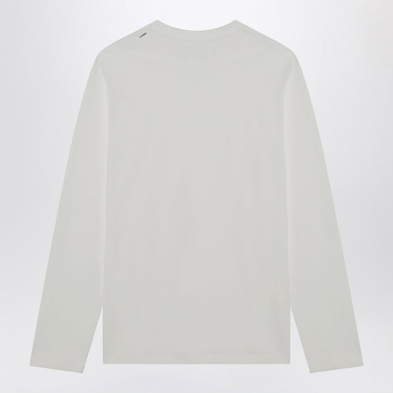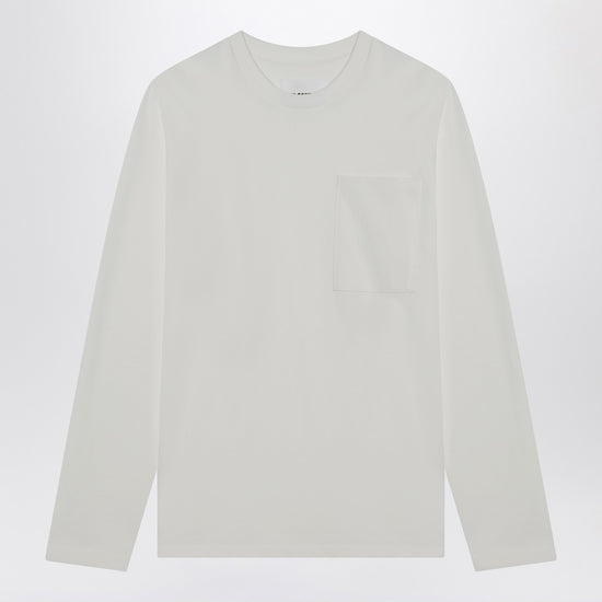 White cotton t-shirt from jil sander featuring long sleeves, a ribbed crew neck, a patch pocket on the chest and a logo patch on the shoulder. size and fit - model wears size l model measurements: height: 185 cm chest: 105 cm waist: 85 cm hips: 100 cm