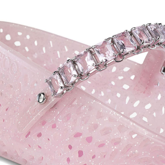 Pink pin closure, flat rubber sole, embossed logo on the side, rhinestone decorations. the jelly glittered ballets