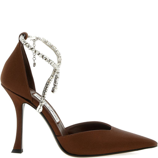 Brown satin finish crystal embellishment adjustable anklet pointed toe spool heel stevie leather pumps
