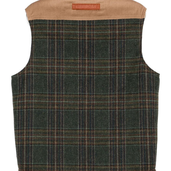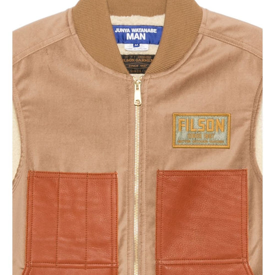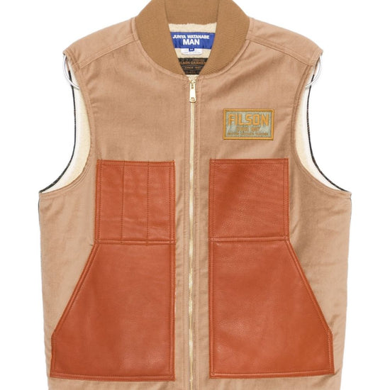Light brown leather panels zip fastening logo patch ribbed collar plaid back panel leather panels vest