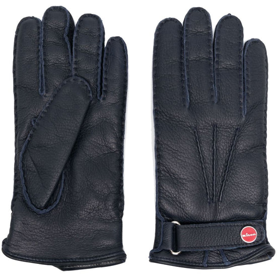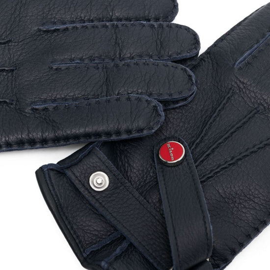Midnight blue calf leather smooth grain full-finger design tonal logo plaque tonal stitching side press-stud fastening full lining leather gloves