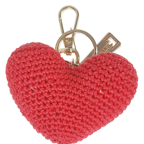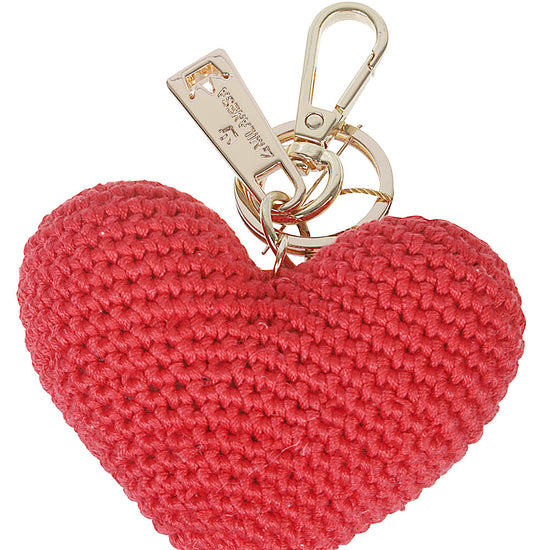 Heart-shaped keychain made of red crochet, embellished with a ring and gold lobster clasp with a logo charm. a small, romantic accessory, ideal as a gift or a stylish accessory to hang on your bag. heart charm
