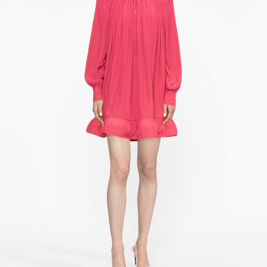 Ruffled charmeuse minidress from lanvin featuring coral red, frilled high neck, front tie fastening, gathered detailing, long sleeves, buttoned cuffs, ruffle hem and thigh-length. scollo v, volant ruffles short dress size and fit - this piece fits true to size. we recommend you get your regular size. model is 1,75m / 5ft 8in wearing size 36 (fr)