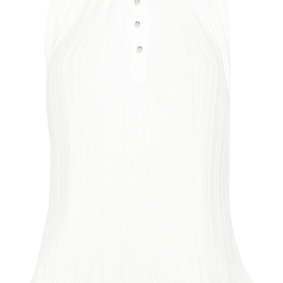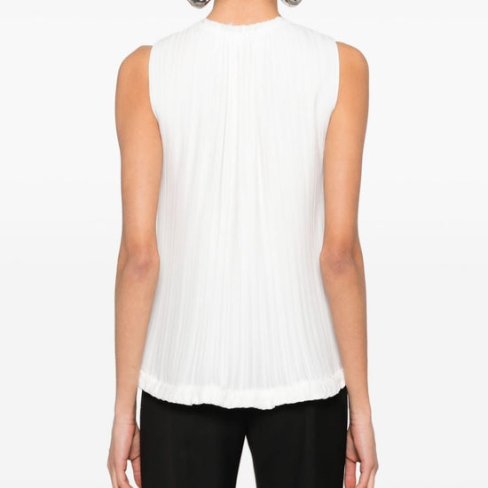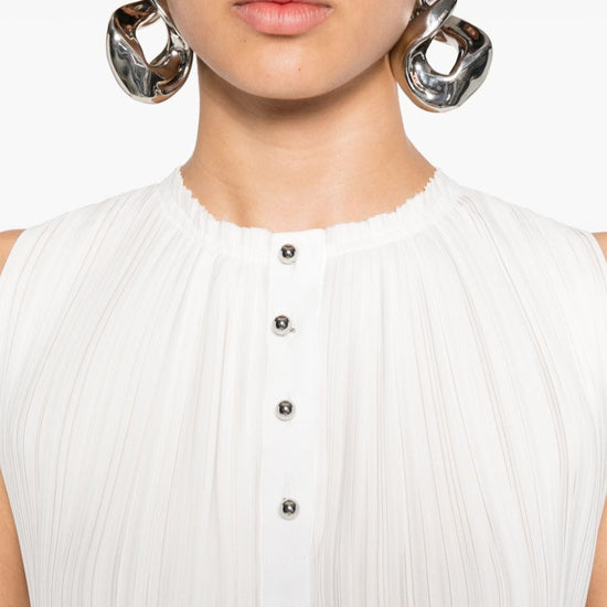 White crepe de chine plissé effect round neck with raw-cut edge sleeveless ruffle hem silver-tone buttons short front button fastening s/m pleated sleeveless top size and fit - this piece fits true to size. we recommend you get your regular size. model is 1,75m / 5ft 8in wearing size 36 (fr)