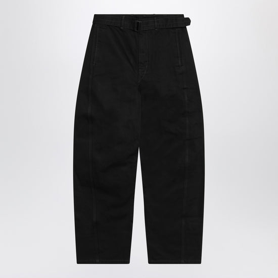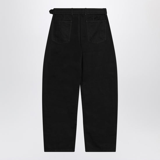 Black cotton denim trousers by lemaire, featuring adjustable waistband, front closure, two side welt pockets, two back patch pockets, and visible stitching. size and fit - model wears size l model measurements: height: 187 cm chest: 102 cm waist: 76 cm hips: 92 cm