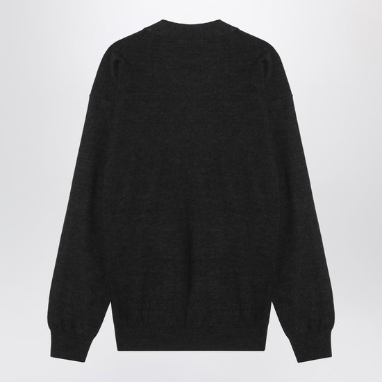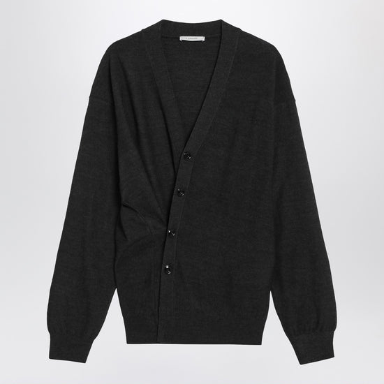 Lemaire anthracite grey wool-blend cardigan, featuring v-neck, long sleeves, asymmetric side button closure, and ribbed trims. size and fit - model wears size s model measurements: height: 178 cm chest: 89 cm waist: 62 cm hips: 88 cm