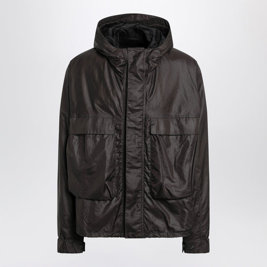 Lemaire lightweight hooded jacket in coffee brown nylon, featuring two flap chest pockets, concealed front closure, long sleeves, and adjustable elastic cuffs.