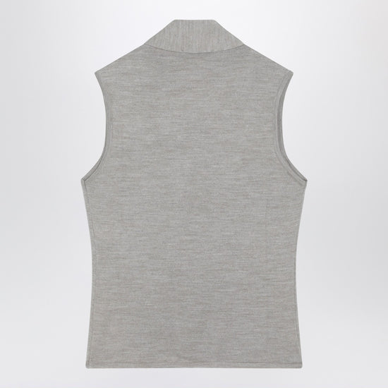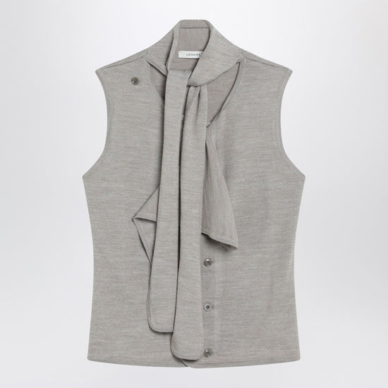 Lemaire light taupe wool-blend vest, featuring asymmetric design with neck tie scarf, button closure, and ribbed trims. size and fit - model wears size s model measurements: height: 182 cm chest: 79 cm waist: 62 cm hips: 90 cm