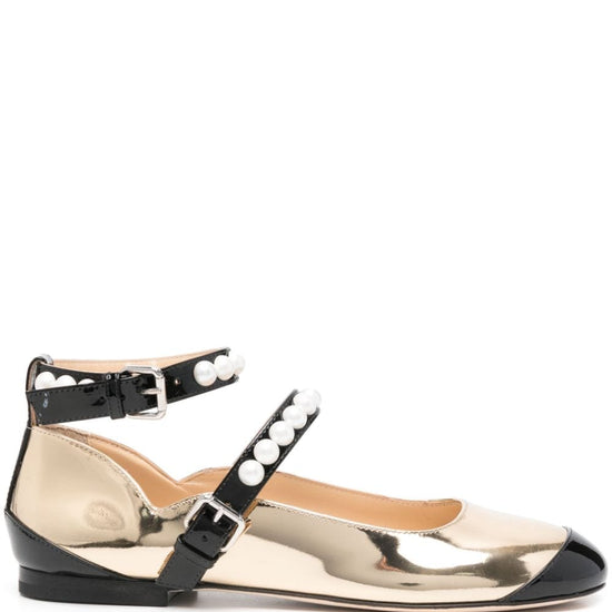 Black/gold-tone calf leather patent finish two-tone design buckle-fastening ankle strap stud detailing round toe branded leather insole flat leather sole rubber outsole leather bicolor ballets size and fit - heel 0,4 in / 1 cm