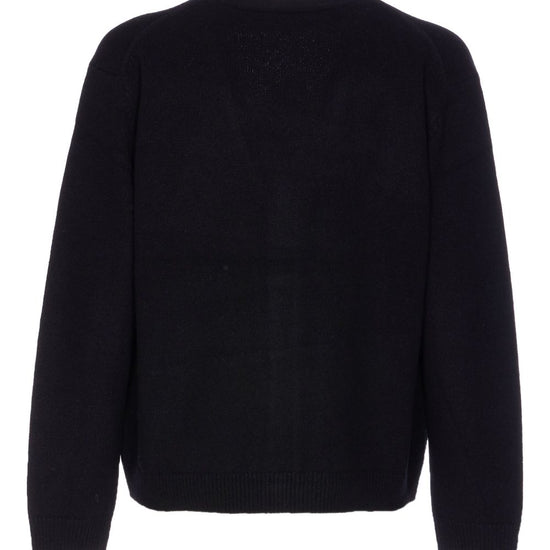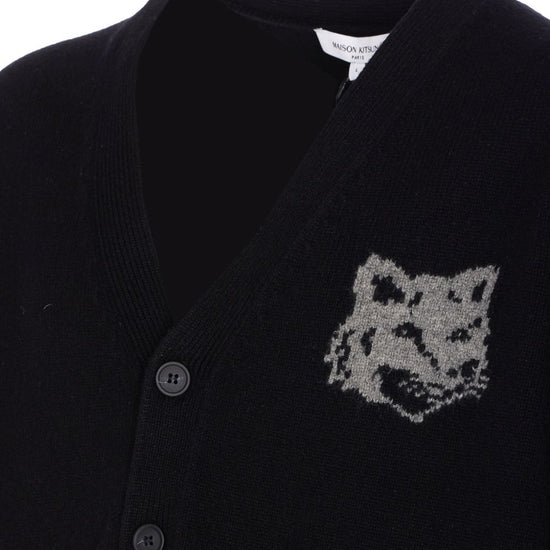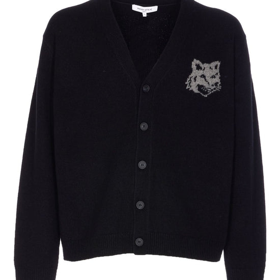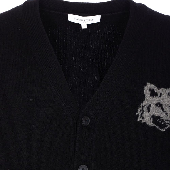 Black fox-head intarsia v-neck button closure long sleeves wool v-necked cardigan