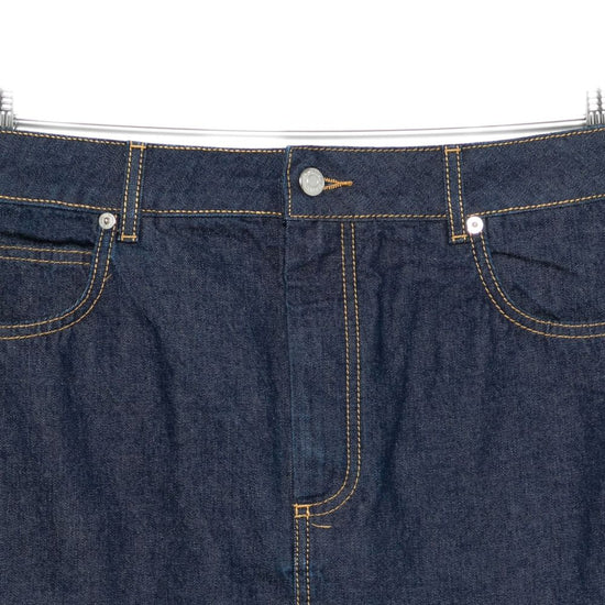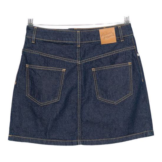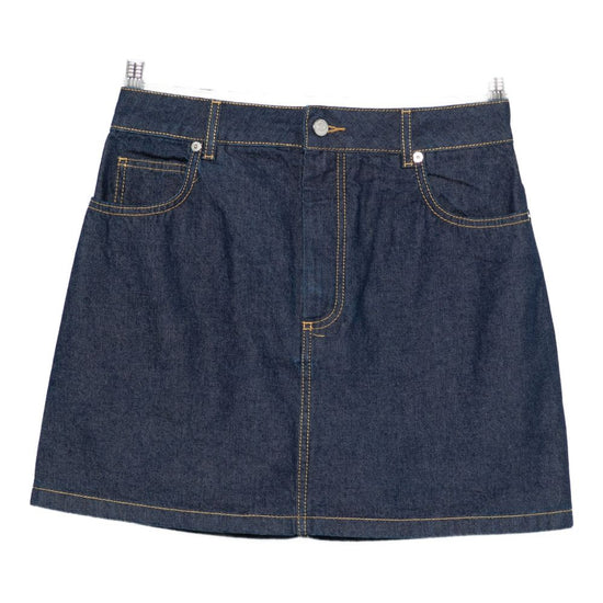 Blue button fly fastening classic five pockets belt loops logo patch denim mini skirt