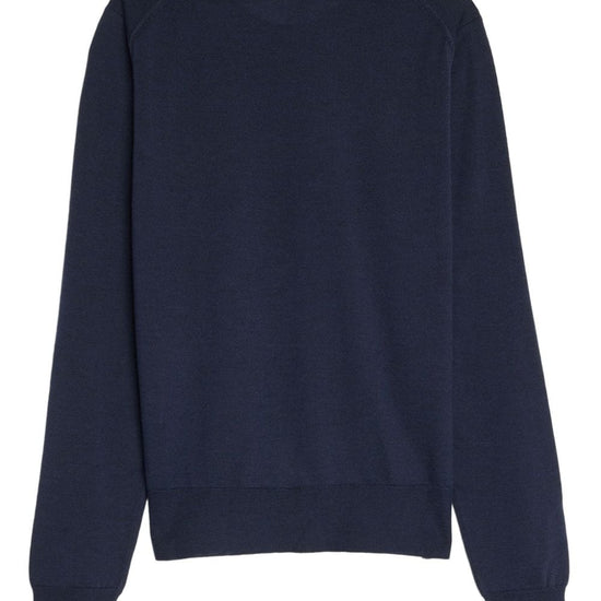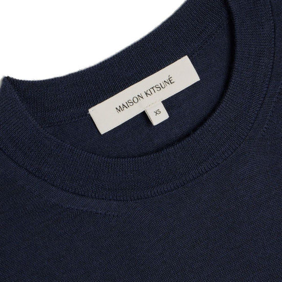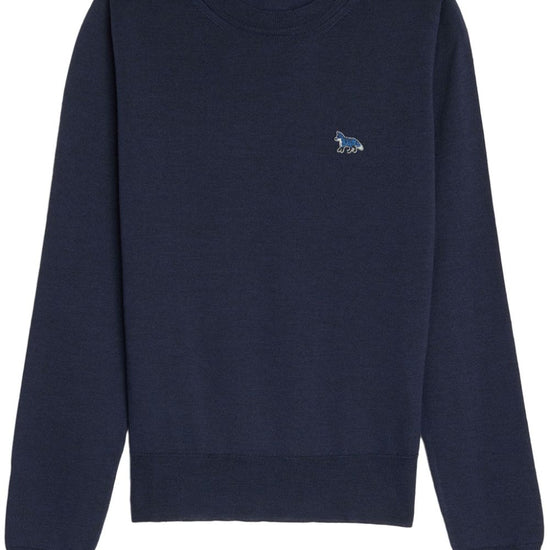 Navy blue merino wool knitted construction ribbed-knit edge mélange effect signature fox motif logo patch at the chest crew neck long sleeves ribbed cuffs and hem straight hem baby fox wool jumper size and fit - this piece fits true to size. we recommend you get your regular size. model is 1,75m / 5ft 8in wearing size s