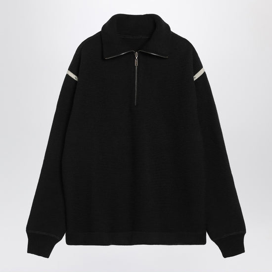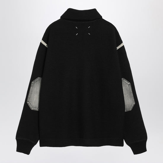 Maison margiela black virgin wool sweater, featuring front zip collar, long sleeves with elbow patches, contrasting distressed details, and horizontal ribbed design. size and fit - model wears size m model measurements: height: 189 cm chest: 104 cm waist: 78 cm hips: 95 cm