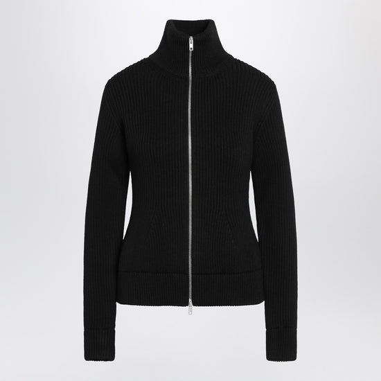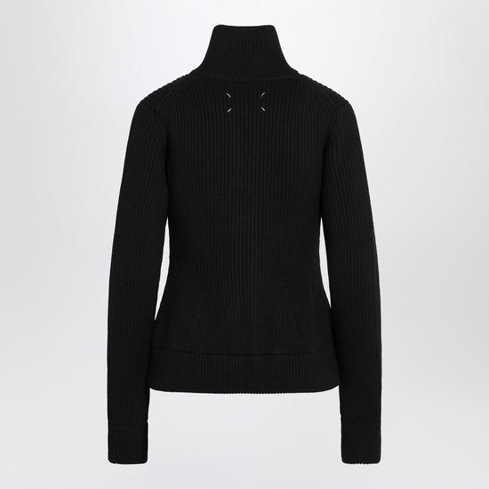 Maison margiela cardigan in black virgin wool, featuring a front closure with exposed double zip, long sleeves, ribbed design, high neck, and four stitches logo on the back. size and fit - model wears size s model measurements: height: 182 cm chest: 79 cm waist: 62 cm hips: 90 cm