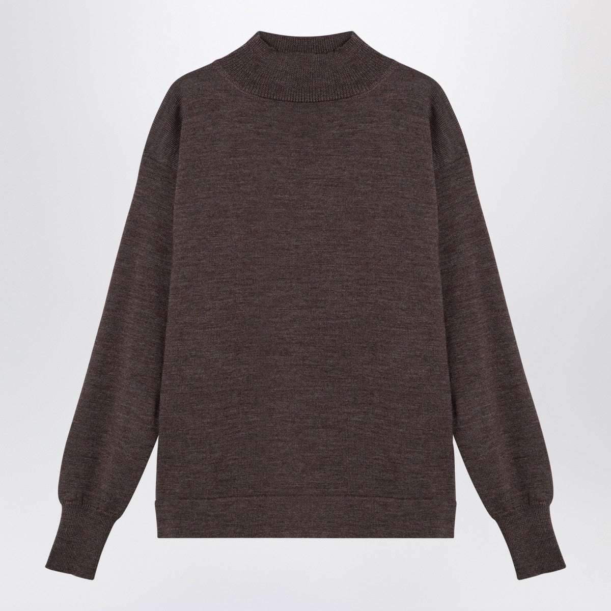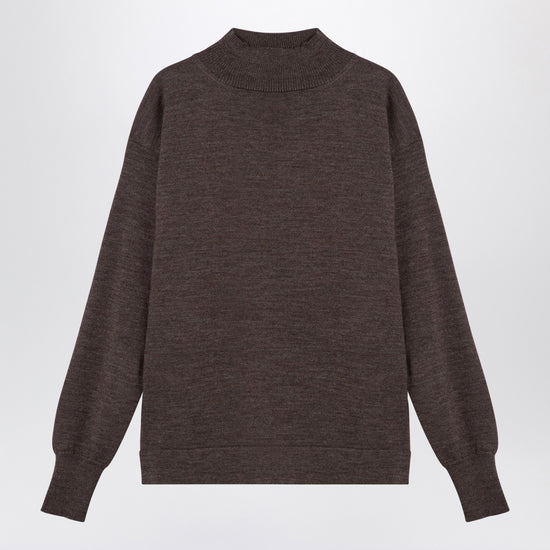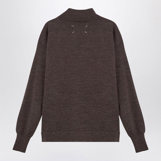 Brown virgin wool sweater from maison margiela featuring long sleeves, high collar, ribbed edges and white logo stitching on the back. size and fit - model wears size m model measurements: height: 187 cm chest: 102 cm waist: 76 cm hips: 92 cm