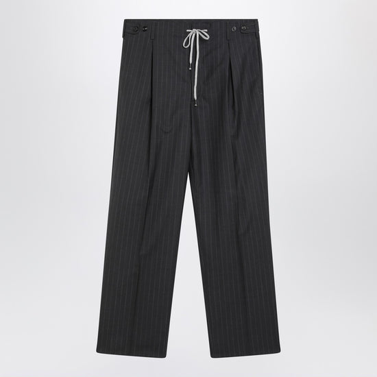 Wide trousers by maison margiela in dark grey pinstriped wool, featuring a drawstring waist with loops and buttons, two side welt pockets, one back welt pocket with button, front pleats, and four stitches logo on the back. size and fit - model wears size 48 it model measurements: height: 187 cm chest: 100 cm waist: 79 cm hips: 96 cm