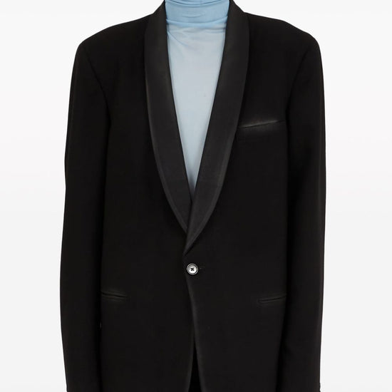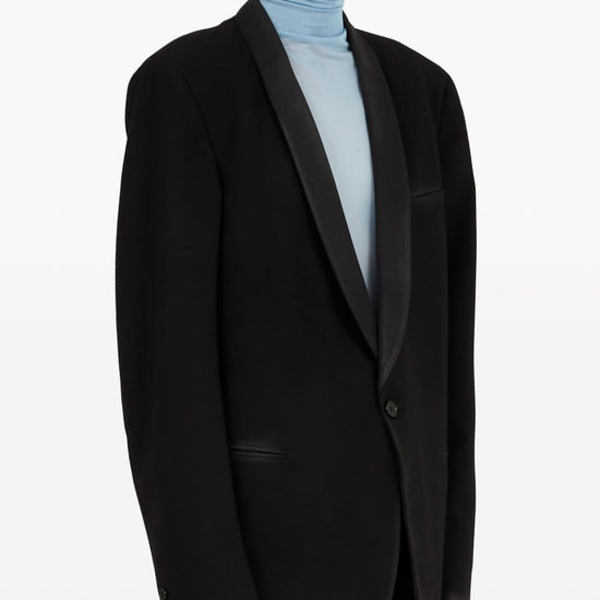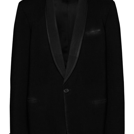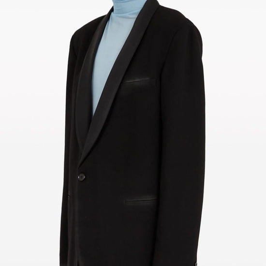 Black wool signature four-stitch logo satin trim shawl collar front button fastening long sleeves chest welt pocket two front jetted pockets straight hem wool single-breasted blazer jacket size and fit - this piece fits true to size. we recommend you get your regular size. model is 1,75m / 5ft 8in wearing size 40 (it)