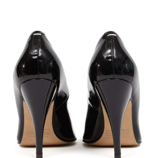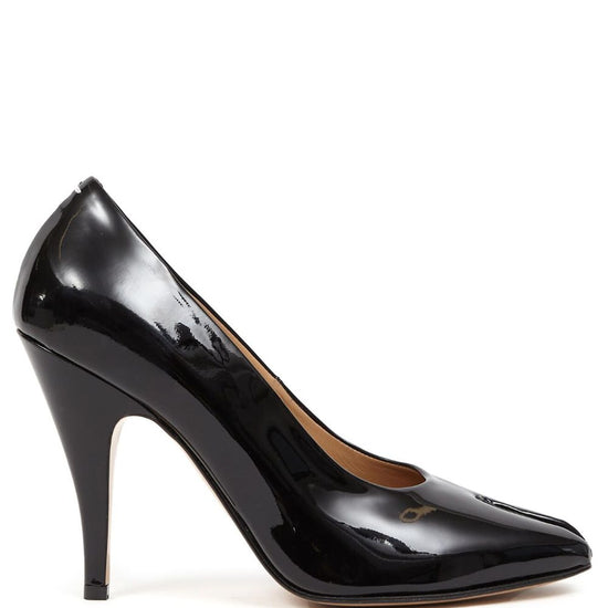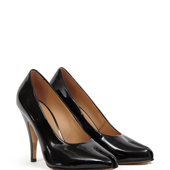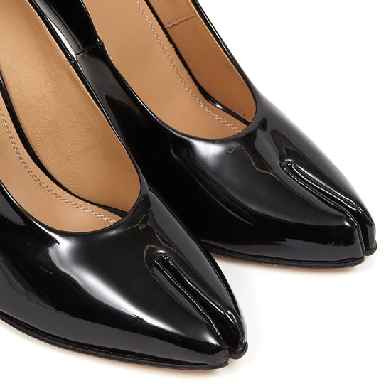 Black lambskin branded leather insole split toe slip-on style 110mm high cone heel tabi patent pumps size and fit - heel 4,3 in / 11 cm