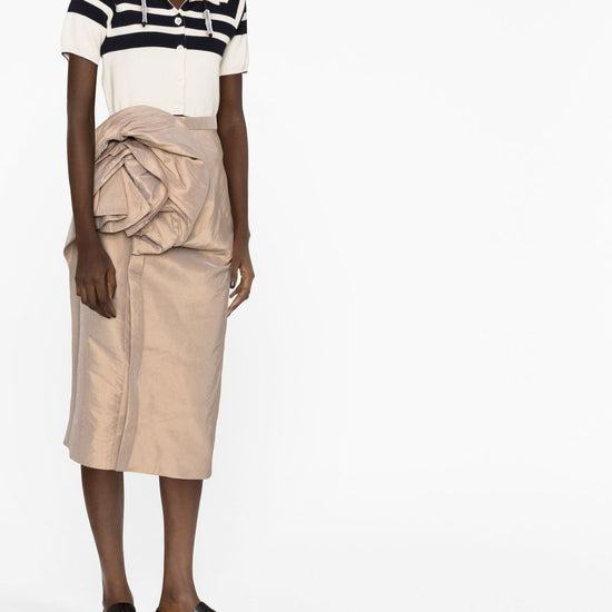 Floral-detail midi skirt from maison margiela featuring gold-tone, satin finish, floral detail, signature four-stitch logo, high-waisted, rear zip fastening, straight hem and mid-length. floral-detail midi skirt size and fit - this piece fits true to size. we recommend you get your regular size. model is 1,75m / 5ft 8in wearing size 40 (it)
