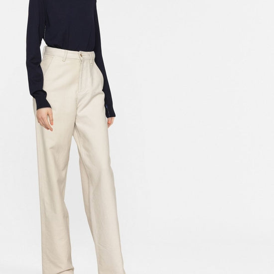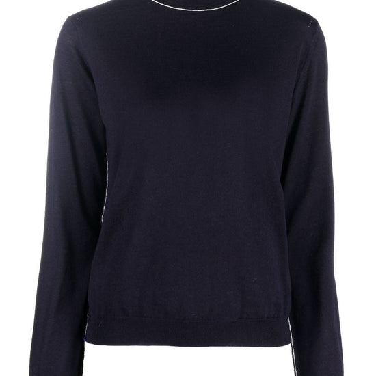 Roll-neck knitted jumper from maison margiela featuring navy blue, wool, knitted construction, contrast stitching, roll neck, long sleeves, ribbed hem and ribbed cuffs. work in progress, fili a contrasto a vista su collo e schiena turtleneck wool sweater size and fit - this piece fits true to size. we recommend you get your regular size. model is 1,75m / 5ft 8in wearing size s