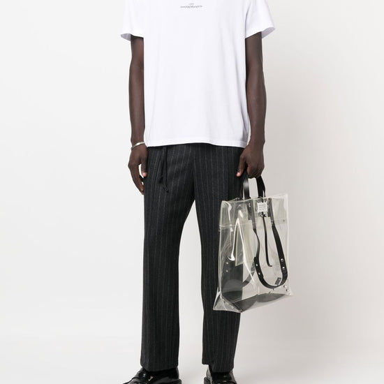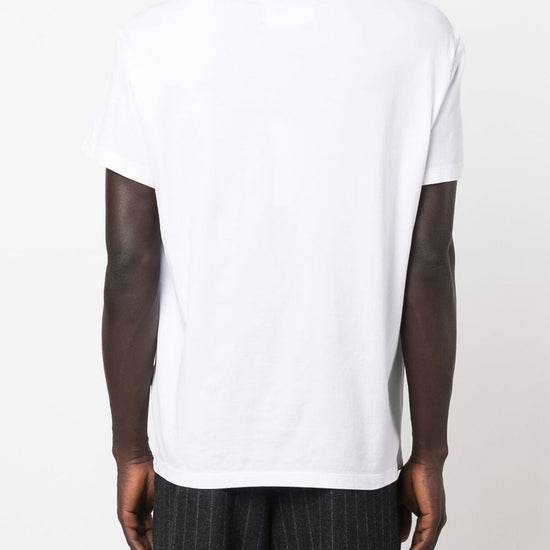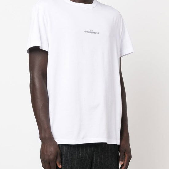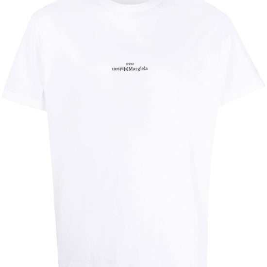 Logo-print short-sleeve t-shirt from maison margiela featuring white, cotton, logo print to the front, round neck and short sleeves. logo piccolo logo cotton t-shirt size and fit - this piece fits true to size. we recommend you get your regular size. model is 1,84m / 6ft 1in wearing size 48 (it)