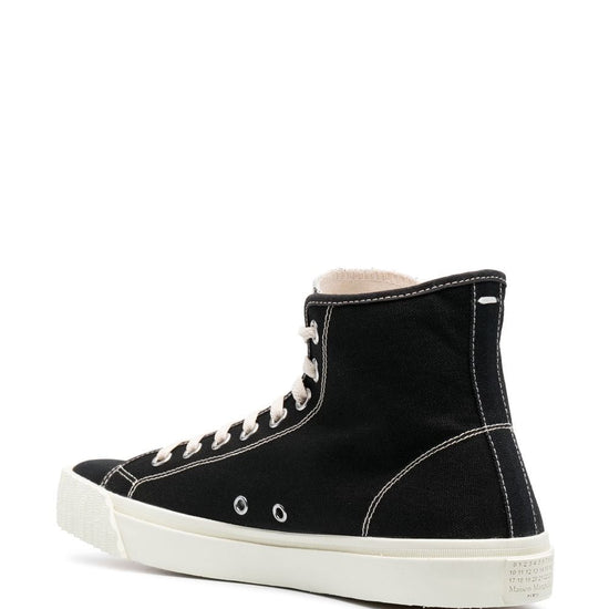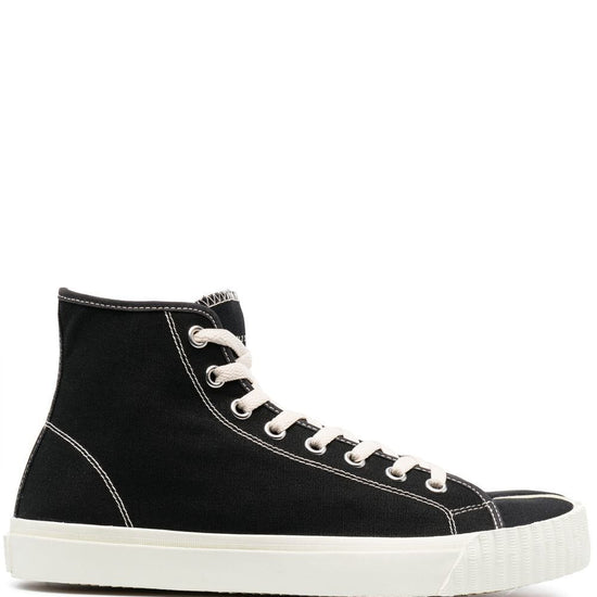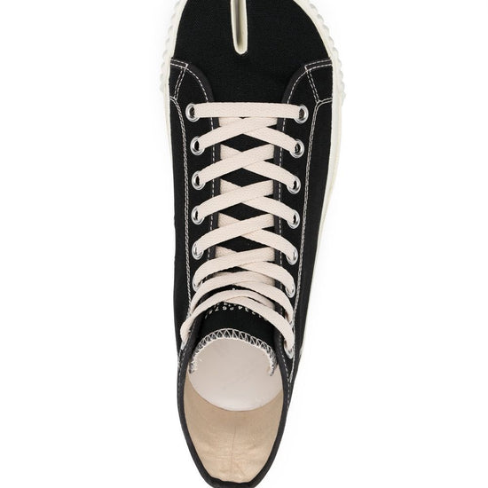 Tabi split-toe high-top sneakers from maison margiela featuring black, cotton, branded leather insole, split toe, front lace-up fastening, ankle-length and flat rubber sole. tabi canvas sneakers size and fit - heel 1,2 in / 3 cm; platform 1,2 in / 3 cm