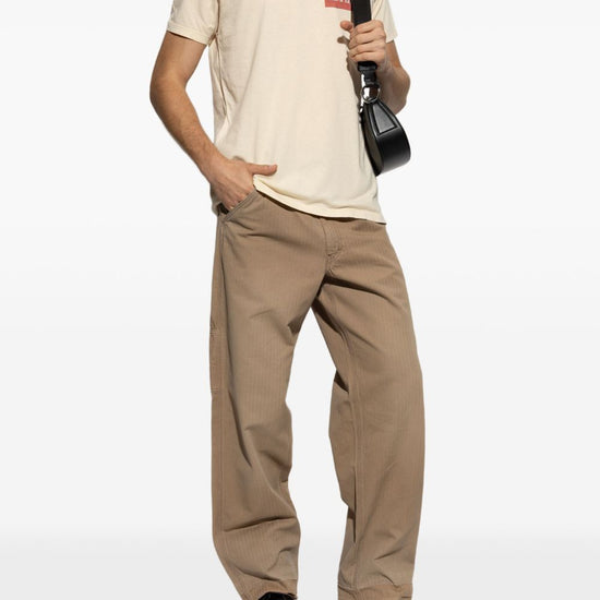 Beige herringbone pattern multiple pockets frayed hems button fly straight leg cotton trousers