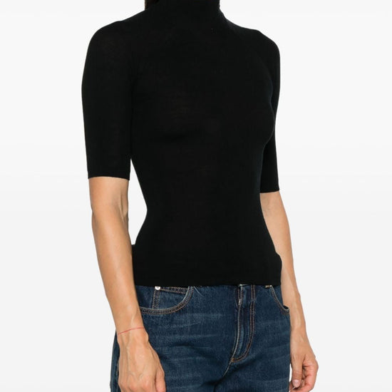 Black merino wool blend roll neck short raglan sleeves straight hem wool and silk blend high-neck sweater size and fit - this piece fits true to size. we recommend you get your regular size. model is 1,75m / 5ft 8in wearing size 1 (num)
