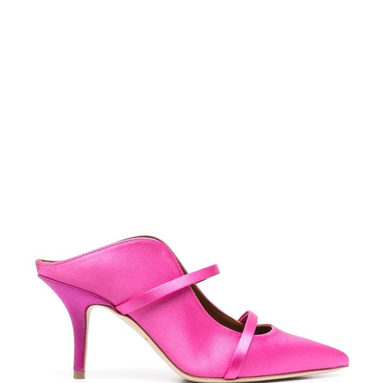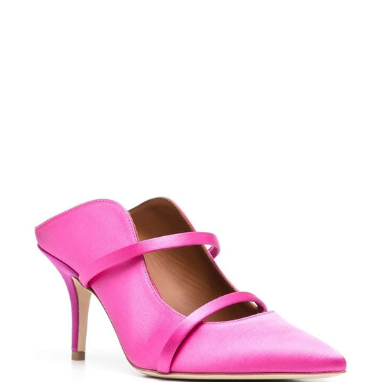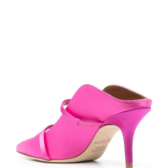 Satin finish pointed toe mules from malone souliers featuring hot pink, calf leather, slip-on style, satin finish, elasticated strap, branded leather insole, mid heel and stiletto heel. maureen 70 satin mules size and fit - heel 3,1 in / 8 cm; platform 0,4 in / 1 cm