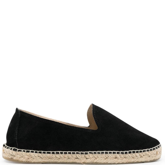 Round toe espadrilles from manebi featuring suede, black, slip-on style, round toe, braided raffia sole and flat sole. hamptons suede espadrilles size and fit - platform 1 in / 2,5 cm