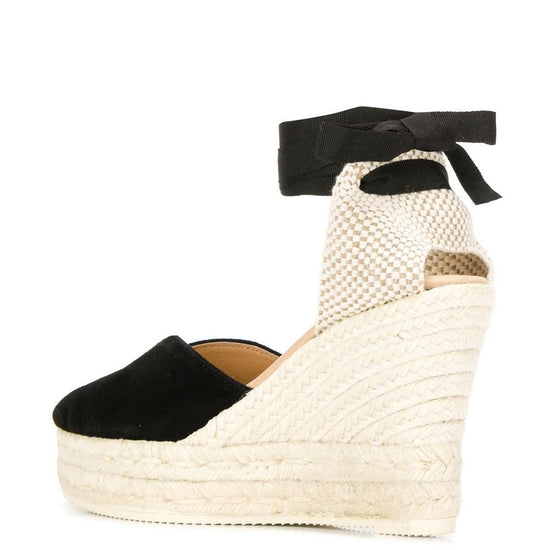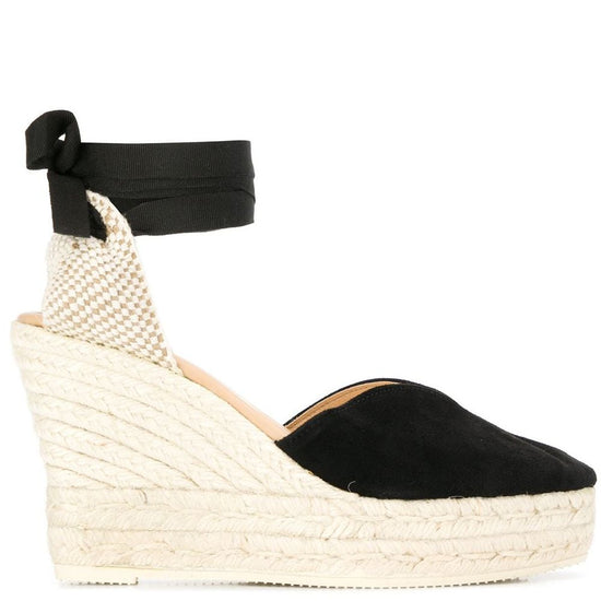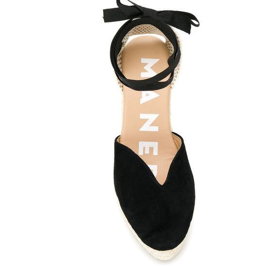 Black leather hamptons wedge espadrilles from manebi featuring a round toe, a high wedge heel and a wrap tie ankle fastening. hamptons suede heart-shaped wedge espadrilles size and fit - heel 4,3 in / 11 cm; platform 1,6 in / 4 cm