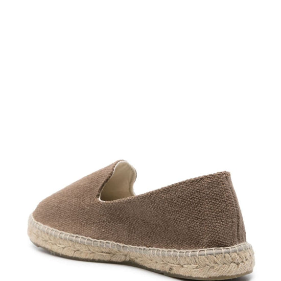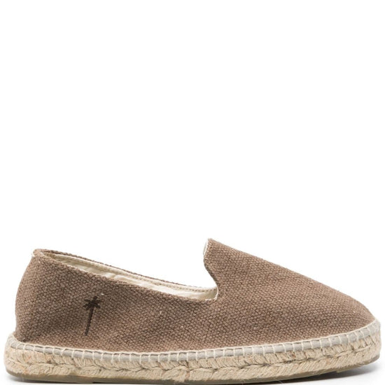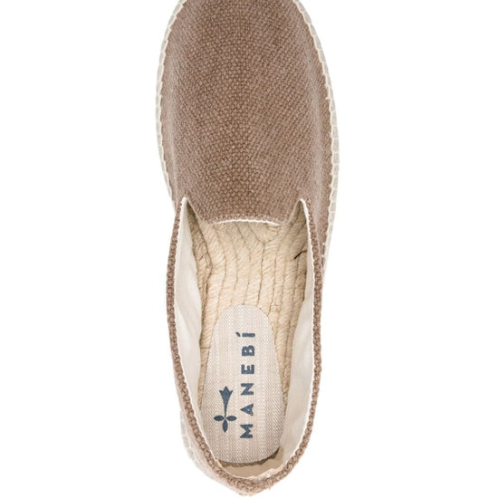 Taupe brown canvas round toe embroidered logo to the side branded insole braided raffia sole slip-on style yucatán canvas espadrilles size and fit - platform 1 in / 2,5 cm