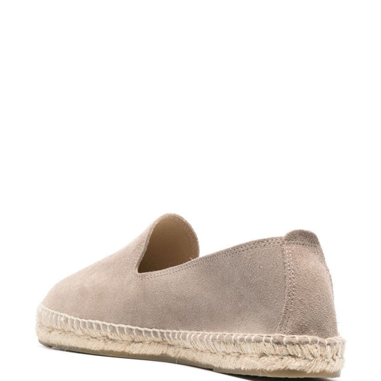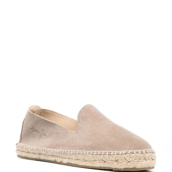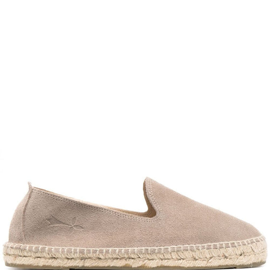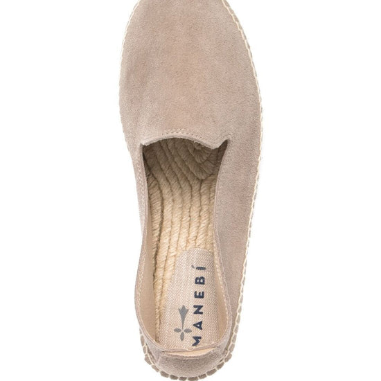Taupe beige suede round-toe suede espadrilles from manebi featuring slip-on style, branded insole and braided raffia sole. hamptons suede espadrilles size and fit - platform 0,8 in / 2 cm