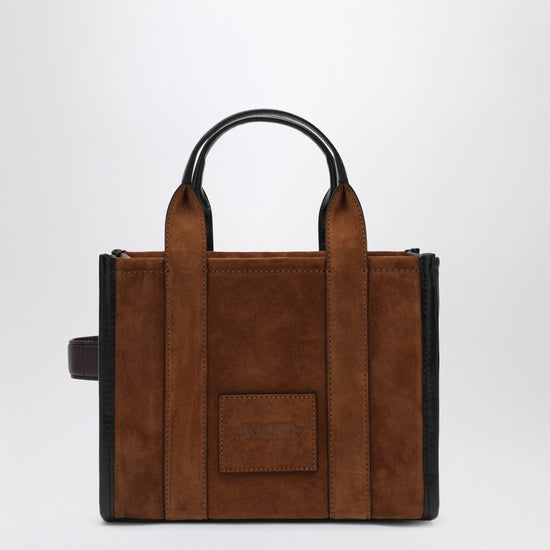 Small tote bag by marc jacobs in suede and leather in copper color, featuring a removable and adjustable shoulder strap, two top handles, zip closure, two slip pockets inside, front logo lettering, and logo patch on the back. size and fit - width 26 cm x height 20 cm x depth 14 cm adjustable shoulder strap length min 69 cm - max 144 cm handle drop: 11 cm
