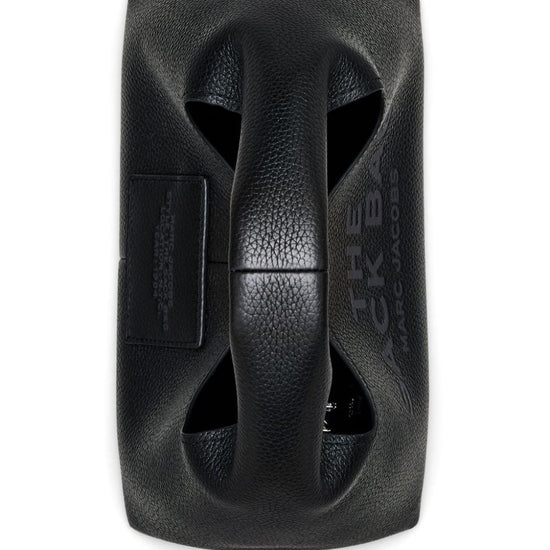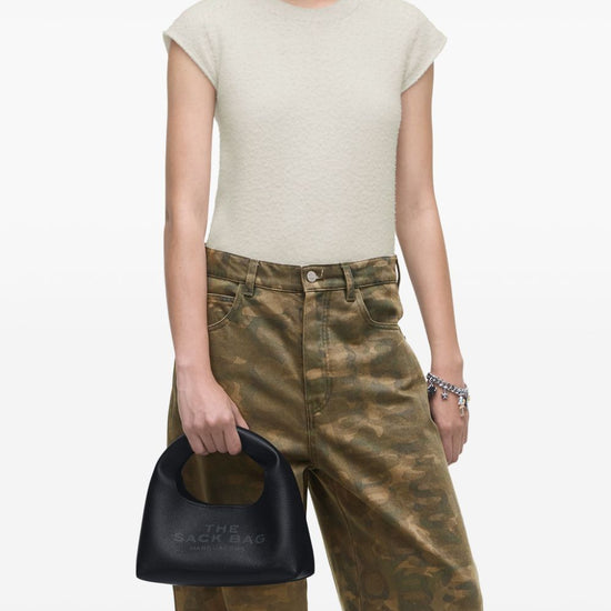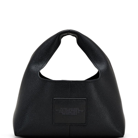 Black leather grained texture embossed logo to the front logo patch to the rear single top handle magnetic fastening internal logo plaque internal zip-fastening pocket partitioned compartment the mini sack leather handbag
