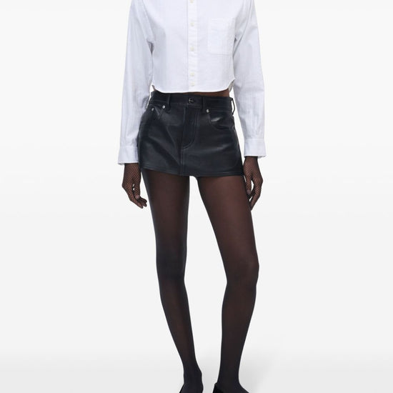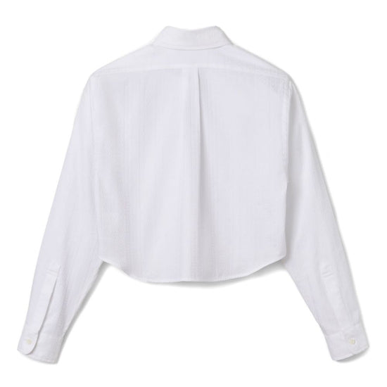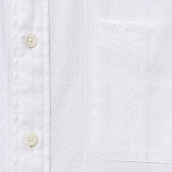 White cotton monogram jacquard front button fastening mother-of-pearl buttons classic collar embroidered logo chest patch pocket pleat detailing cropped curved hem cotton shrirt size and fit - this piece fits true to size. we recommend you get your regular size. model is 1,75m / 5ft 8in wearing size s