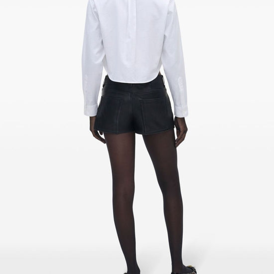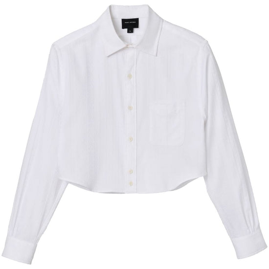 White cotton monogram jacquard front button fastening mother-of-pearl buttons classic collar embroidered logo chest patch pocket pleat detailing cropped curved hem cotton shrirt size and fit - this piece fits true to size. we recommend you get your regular size. model is 1,75m / 5ft 8in wearing size s