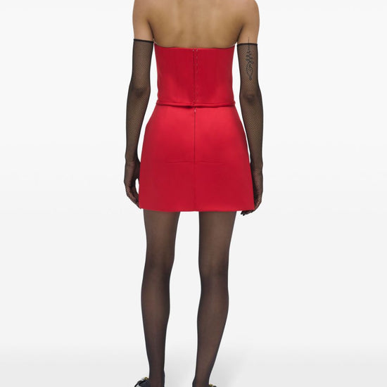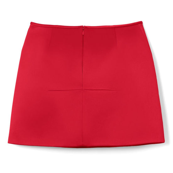 Red satin finish bias cut rear zip fastening dart detailing side slit above-knee length duchess satin skirt size and fit - this piece fits true to size. we recommend you get your regular size. model is 1,75m / 5ft 8in wearing size 4 (us)
