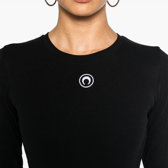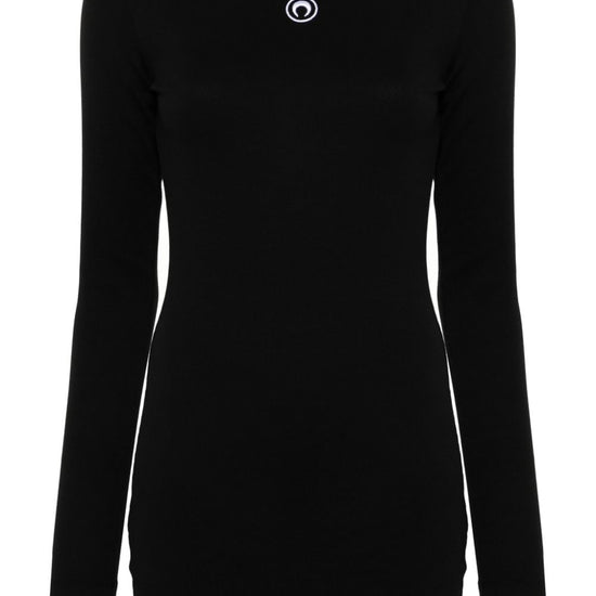 Black organic cotton blend fine ribbed crew neck long sleeves crescent moon embroidery thigh-length straight hem moon cotton mini dress