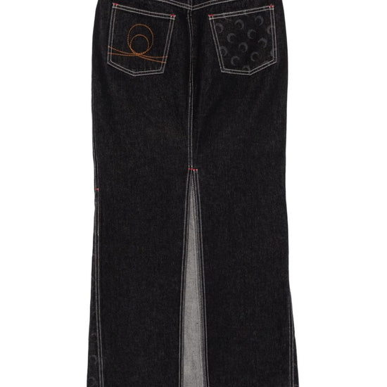 Black organic cotton denim panelled design crescent moon print front button and zip fastening belt loops contrast stitching classic five pockets logo patch to the rear crescent moon embroidery rear slit asymmetric hem long length this item is made from at least 50% organic materials. learn more about what makes a product conscious on our conscious criteria page moon denim long skirt size and fit - this piece fits true to size. we recommend you get your regular size. model is 1,75m / 5ft 8in wearing size 36 (fr)