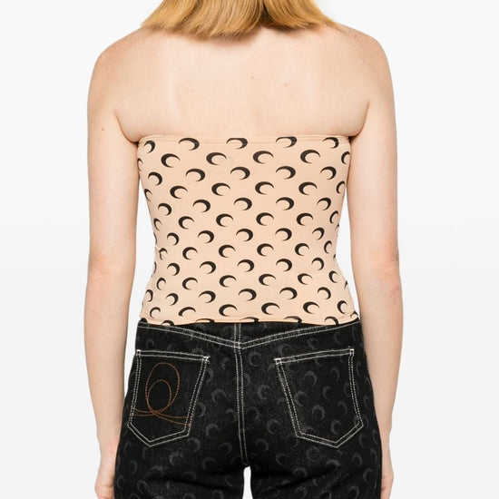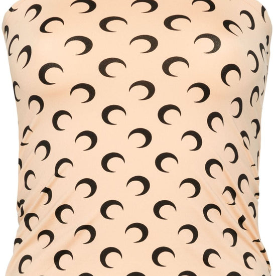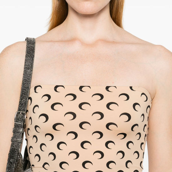 Light beige/black recycled polyamide-recycled elastane blend stretch-jersey crescent moon print strapless straight hem moon offshoulder tube top