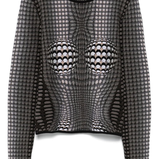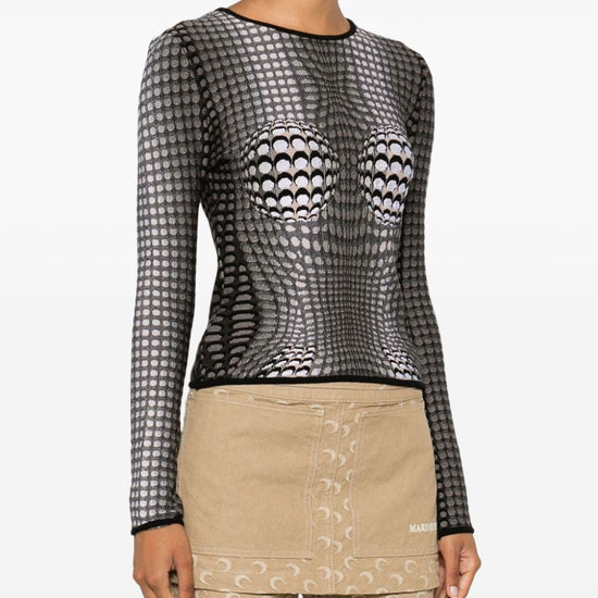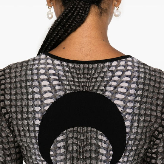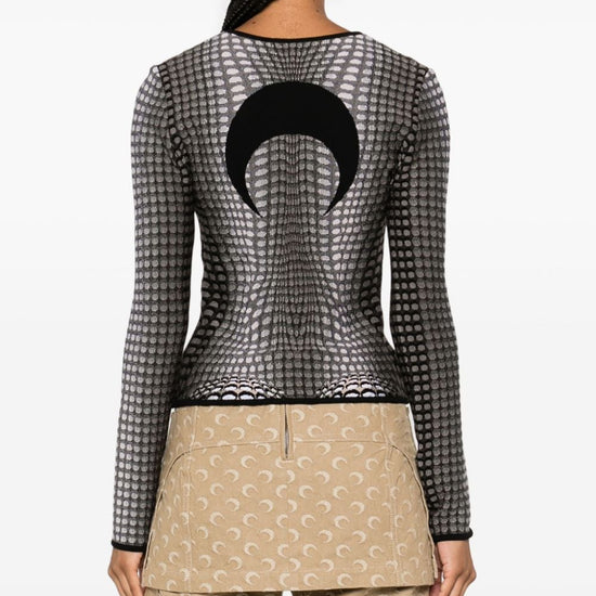 Stone grey knitted construction trompe l'oeil jacquard crescent moon jacquard at the back contrasting trim crew neck long sleeves straight hem m/l, moon allover moon longsleeves top size and fit - this piece fits true to size. we recommend you get your regular size. model is 1,75m / 5ft 8in wearing size s