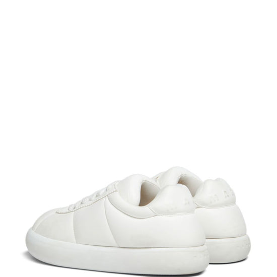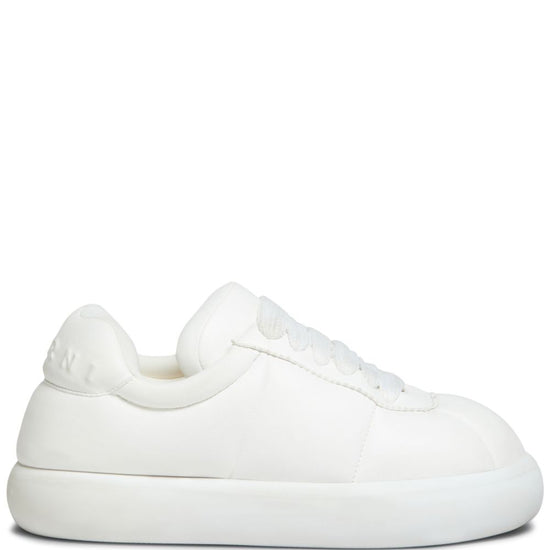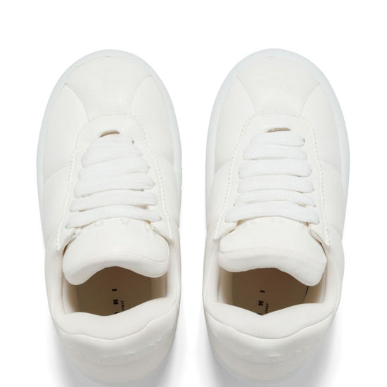 White leather padded design logo-embossed tongue branded heel counter round toe front lace-up fastening branded leather insole flat rubber sole bigfoot 2.0 leather sneakers size and fit - platform 1,6 in / 4 cm