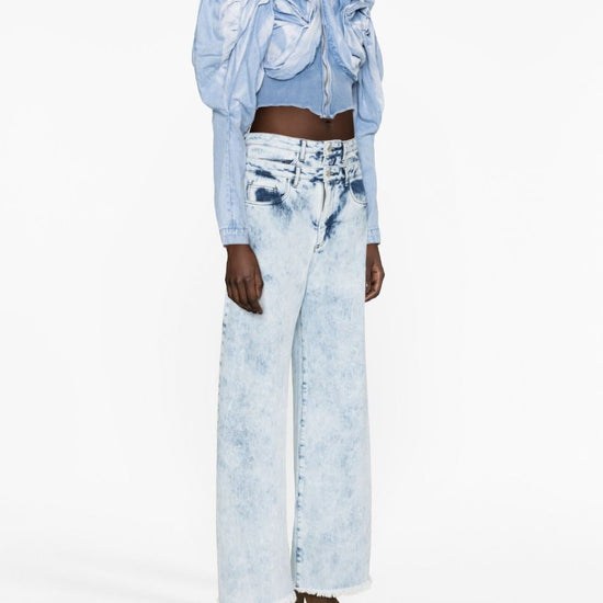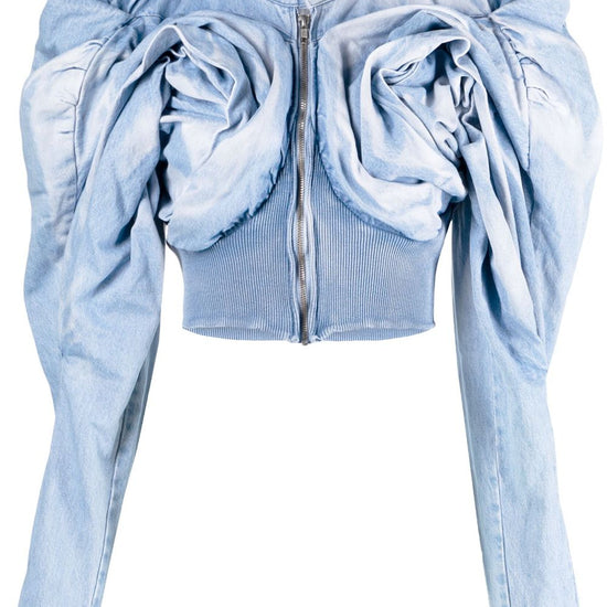 Scrapyard draped cropped jacket from masha popova featuring light blue, cotton, denim, bleach wash, draped detailing, ribbed panelling, stand-up collar, front button and zip fastening, long puff sleeves, cropped and straight hem. drappeggiato draped denim jacket size and fit - this piece fits true to size. we recommend you get your regular size. model is 1,75m / 5ft 8in wearing size s
