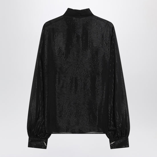Black silk chiffon blouse with lamé striped pattern, removable bow tie, fluid fit, shirt collar, long sleeves with cufflinks, concealed front button closure, side slits, rounded hem and matching camisole. size and fit - model wears size 40 it model measurements: height: 182 cm chest: 79 cm waist: 62 cm hips: 90 cm